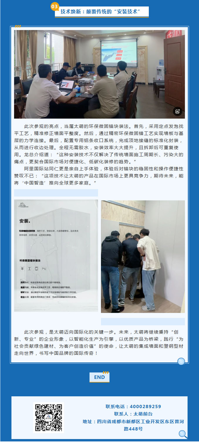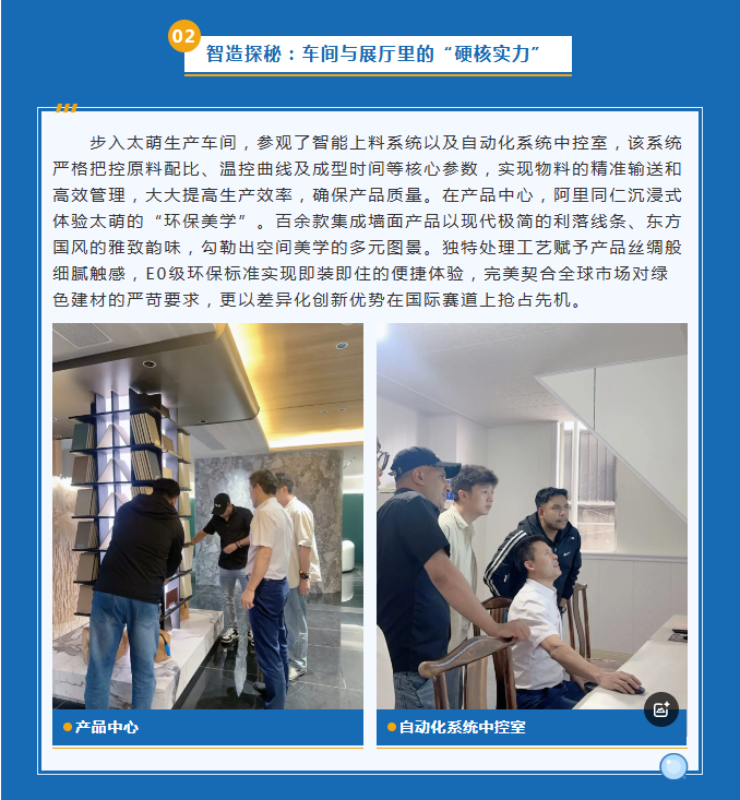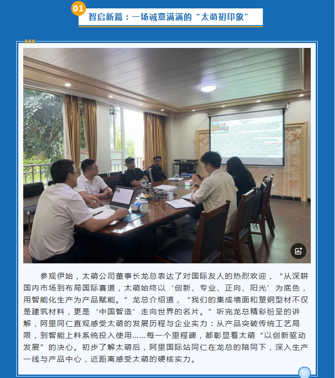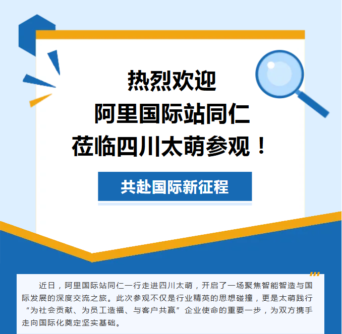 【概要描述】近日,阿里國際站同仁一行走進四川太萌,開啟了一場聚焦智能智造與國際發展的深度交流之旅。此次參觀不僅是行業精英的思想碰撞,更是太萌踐行“為社會貢獻、為員工造福、與客戶共贏”企業使命的重要一步,為雙方攜手走向國際化奠定堅實基礎
