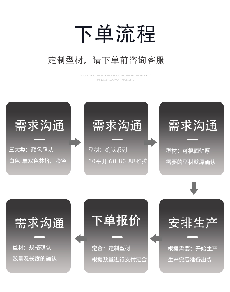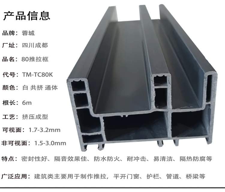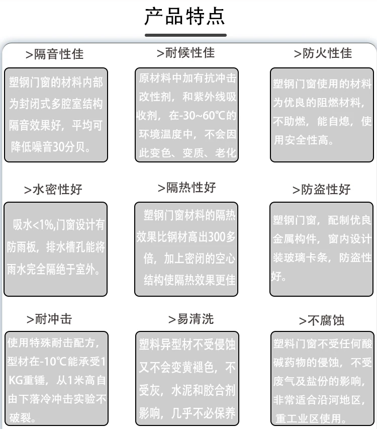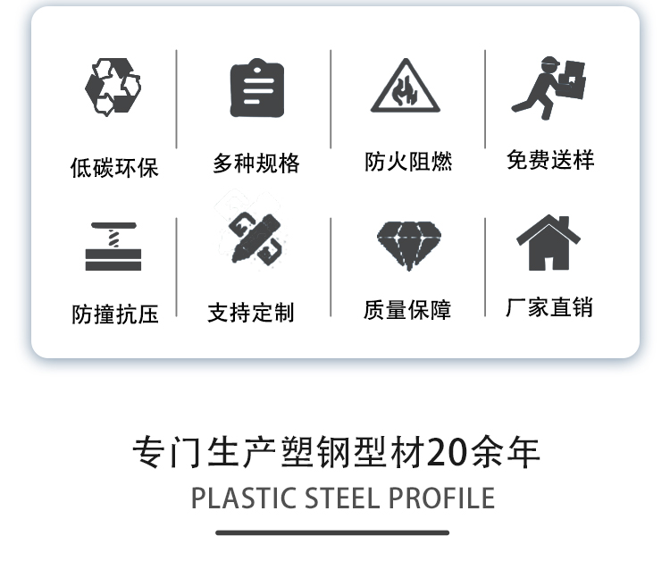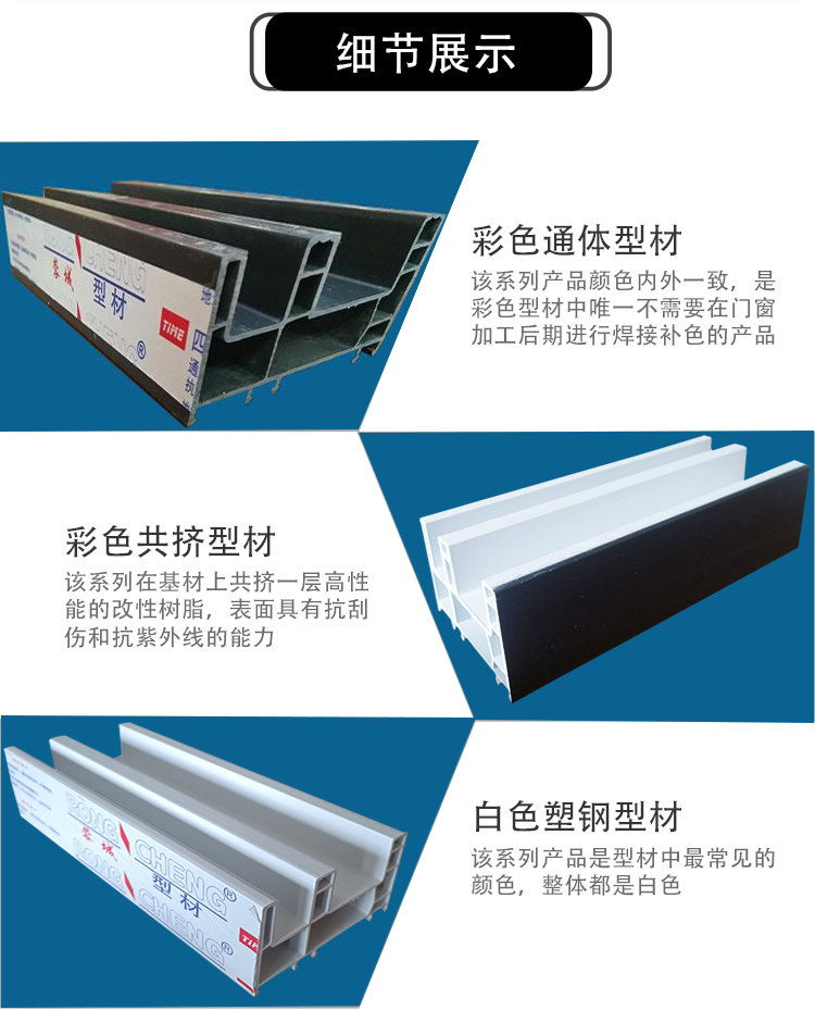 公司開發生產的塑鋼型材現有60平開和推拉系列、80推拉系列、88推拉系列,可制作固定、內外平開、推拉、上懸窗、下懸窗、百葉窗等,品種規格齊全。采用新技術、新配方,確保產品色澤一致,以及采用先進焊接平整工藝,使結構更堅固、質量更放心。本系列產品是以塑代木、代鋼、代鋁的“第四代門窗”,具有防火阻燃、耐腐蝕、隔音隔熱、外觀精美、品種新穎、不易老化、不易褪色、清洗方便等特點。主要顏色有白色、灰色、咖啡色等,可根據居室裝飾的特點確保協調一致,使你家居生活更顯示尊貴。產品適用于賓館、辦公樓、家裝門窗使用,為同類產品之精品。